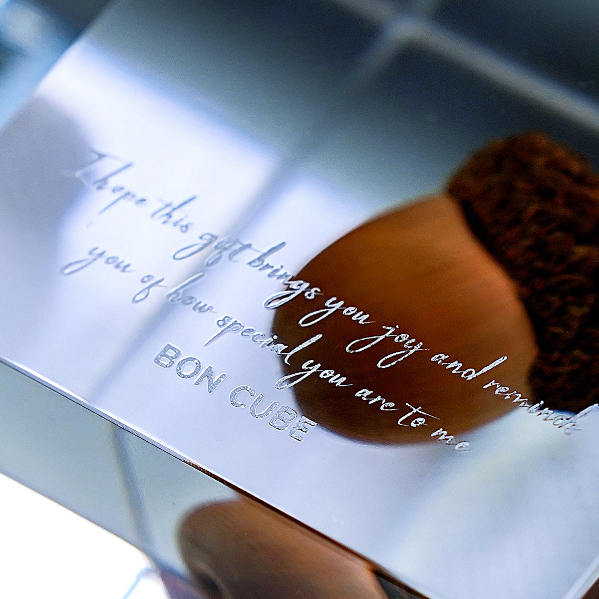 Each cube can be tailored to your needs — from laser engraving logos, names, or messages with 0.1 mm precision to embedding custom items such as company products or symbolic keepsakes. Whether for recognition, branding, or gifting, every detail is made to express your story in an elegant, lasting form.